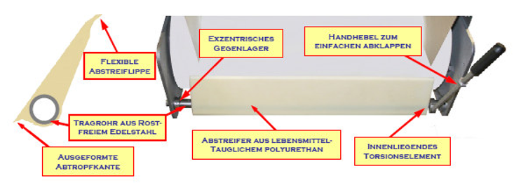 Der Bandabstreifer besteht aus speziell entwickeltem Polyurethan (für Lebensmittel zugelassen), mit sehr gutem Gleit- und Verschleiß- verhalten.