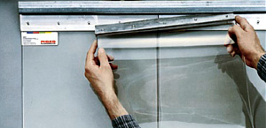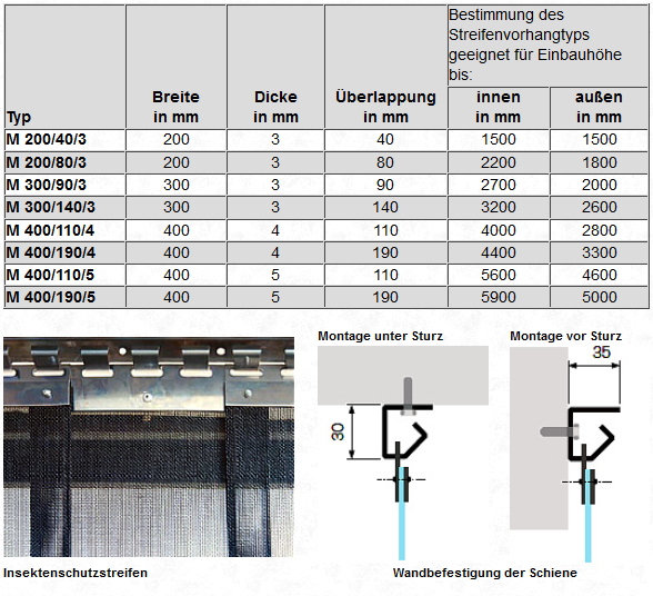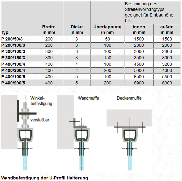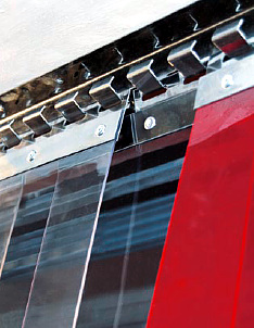 Die PVC-Streifen werden mit ihrer Halterung in das U-Profil eingeklemmt. Dies ermöglicht einfache Erneuerung und Entfernung einzelner Streifen. Das Überlappungsmaß ist abhängig von Streifenbreite bzw. -länge und Materialstärke und entspricht 50 oder 100 %.