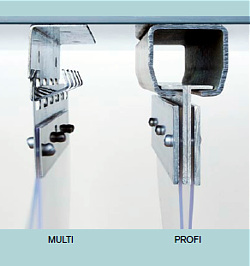 Die Schienen aus verzinktem Stahl sind bis 6000 mm Länge erhältlich und können mit Muffen verbunden werden. Bis 2,50 m Breite ist eine selbsttragende Montage möglich.